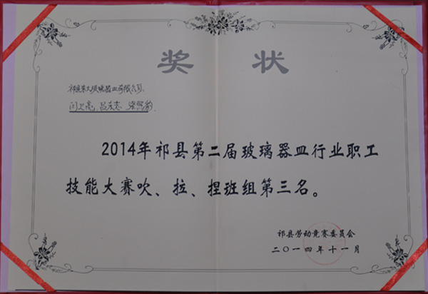 2014年被“中國(guó)日用玻璃協(xié)會(huì)授予高腳帝王杯、公爵杯榮譽(yù)稱(chēng)號(hào)”